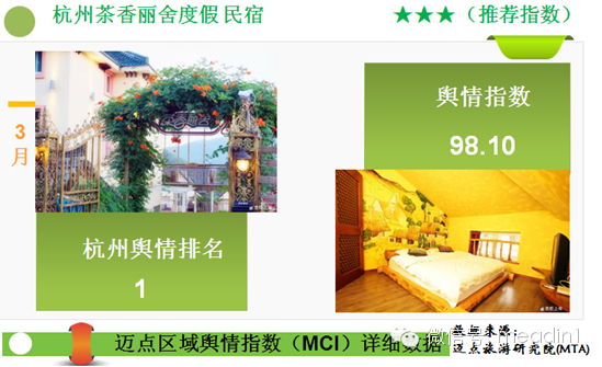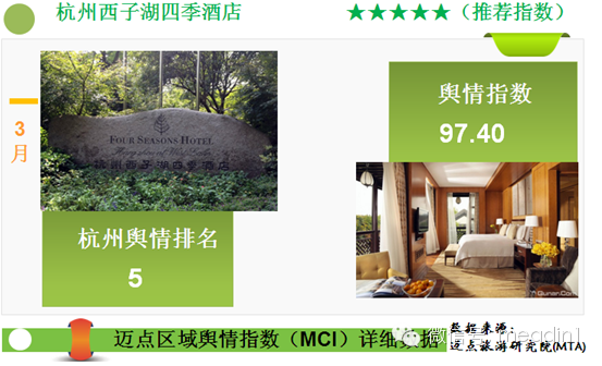 迈点区域酒店舆情指数(MCI)显示,杭州茶香丽舍度假民宿位列3月杭州地区第一,杭州逸酒店、杭州岸香青年假日旅馆、杭州温德姆至尊豪廷大酒店、杭州西子湖四季酒店分列二到五位。