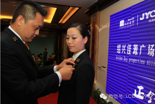 授徽仪式上,金钥匙总部代表杨锐毅先生宣读会员批准书后,由金钥匙副秘书长张涛先生为新会员任东琴女士佩戴金钥匙领徽和徽章,并对绍兴地区再添一名服务精英予以衷心祝贺。